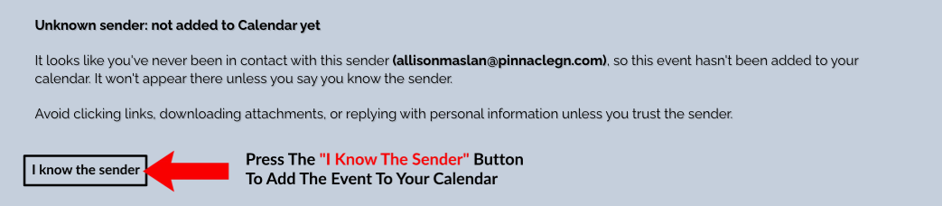 To add the event to your calendar you may need to go to your email and open “invitation from an unknown sender” from an @pinnaclegn.com domain, and click the “I Know The Sender” button
